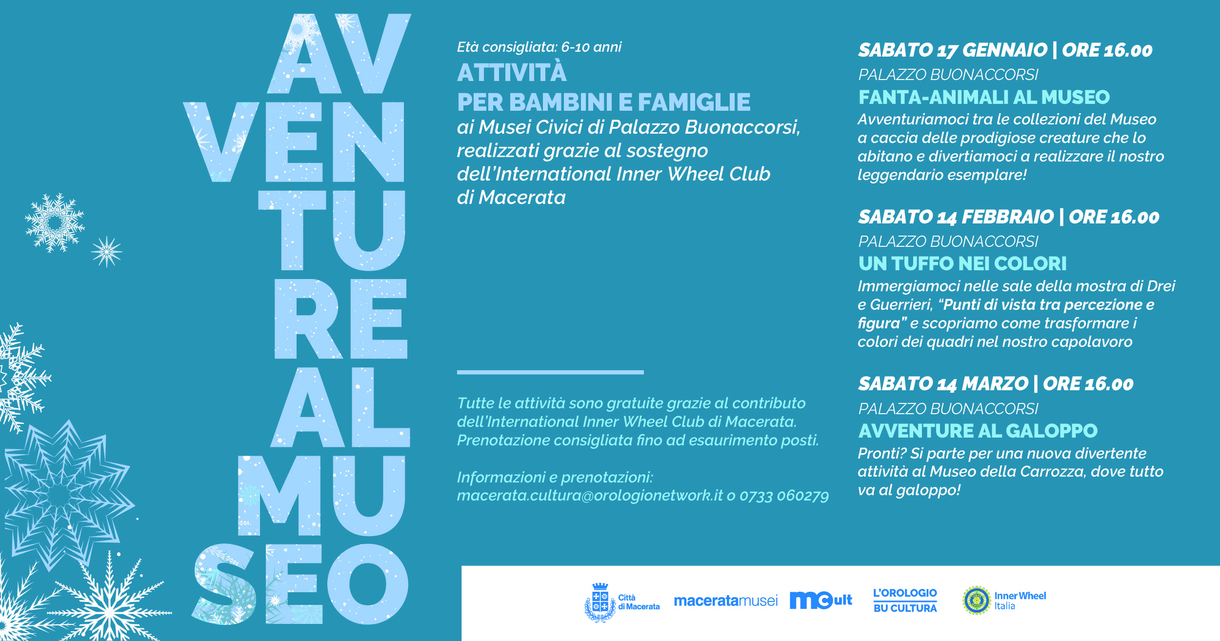 Tutte le attività sono gratuite grazie al contributo dell’International Inner Wheel Club di Macerata. Prenotazione consigliata fino ad esaurimento posti.