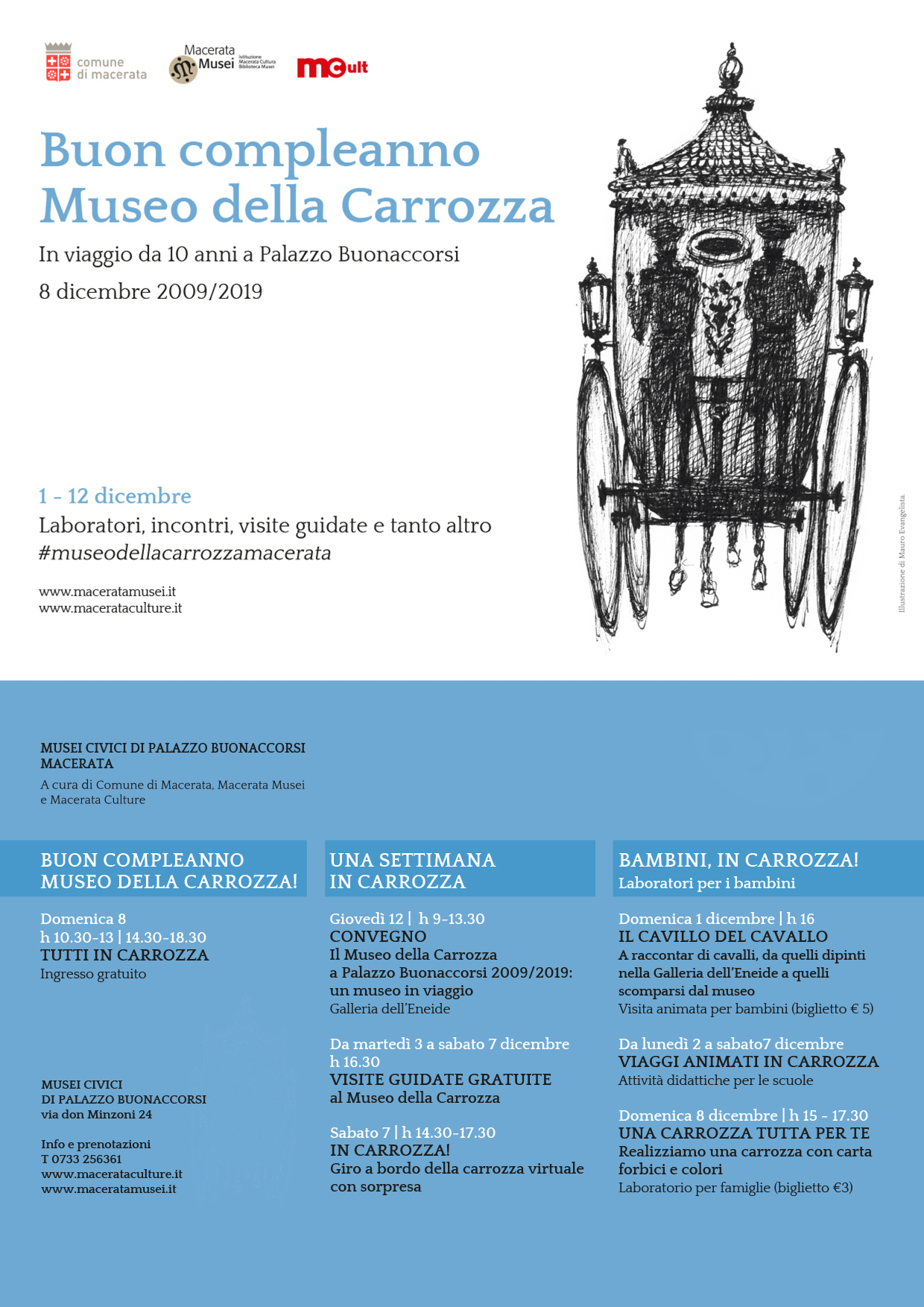 L’8 dicembre del 2009 si inaugurava il nuovo Museo della carrozza trasferito a Palazzo Buonaccorsi. Con il programma “Buon compleanno Museo della carrozza” il Comune di Macerata festeggia i dieci anni di attività con laboratori, incontri e visite guidate. Un’occasione per rinnovare la collaborazione con il Lions Club che negli anni ha mantenuto un’attenzione speciale verso questa collezione promuovendone la valorizzazione con studi e pubblicazioni. Sarà questo il tema del convegno “Il Museo della carrozza a Palazzo Buonaccorsi 2009/2019: esperienze e prospettive” che avrà luogo nella mattinata del 12 dicembre dalle 9 alle 13.30.