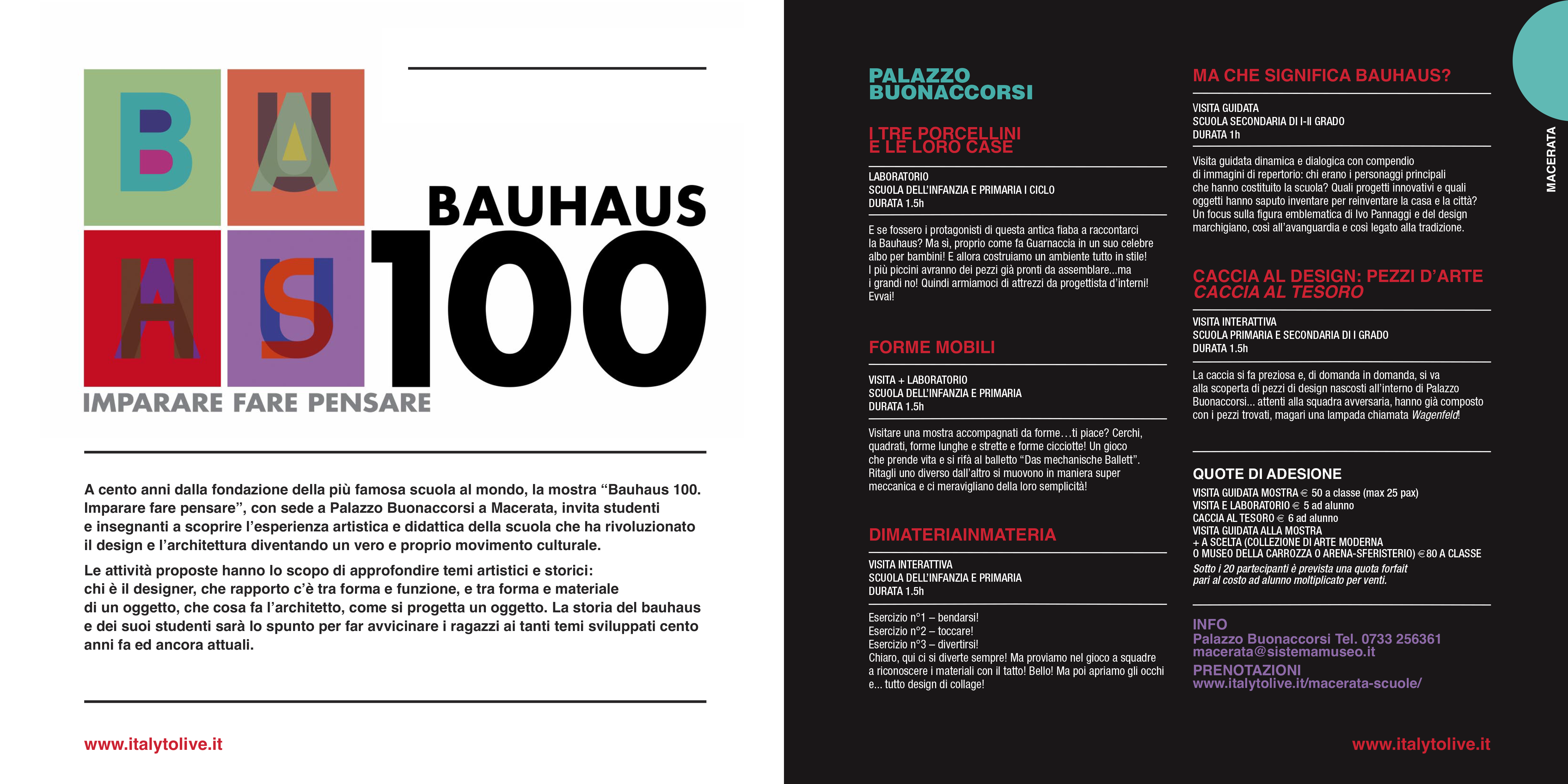 A cento anni dalla fondazione della più famosa scuola al mondo, la mostra “Bauhaus 100.Imparare fare pensare”, con sede a Palazzo Buonaccorsi a Macerata, invita studenti e insegnanti a scoprire l’esperienza artistica e didattica della scuola che ha rivoluzionato il design e l’architettura diventando un vero e proprio movimento culturale. Le attività proposte hanno lo scopo di approfondire temi artistici e storici: chi è il designer, che rapporto c’è tra forma e funzione, e tra forma e materiale di un oggetto, che cosa fa l’architetto, come si progetta un oggetto. La storia del bauhaus e dei suoi studenti sarà lo spunto per far avvicinare i ragazzi ai tanti temi sviluppati cento anni fa ed ancora attuali.